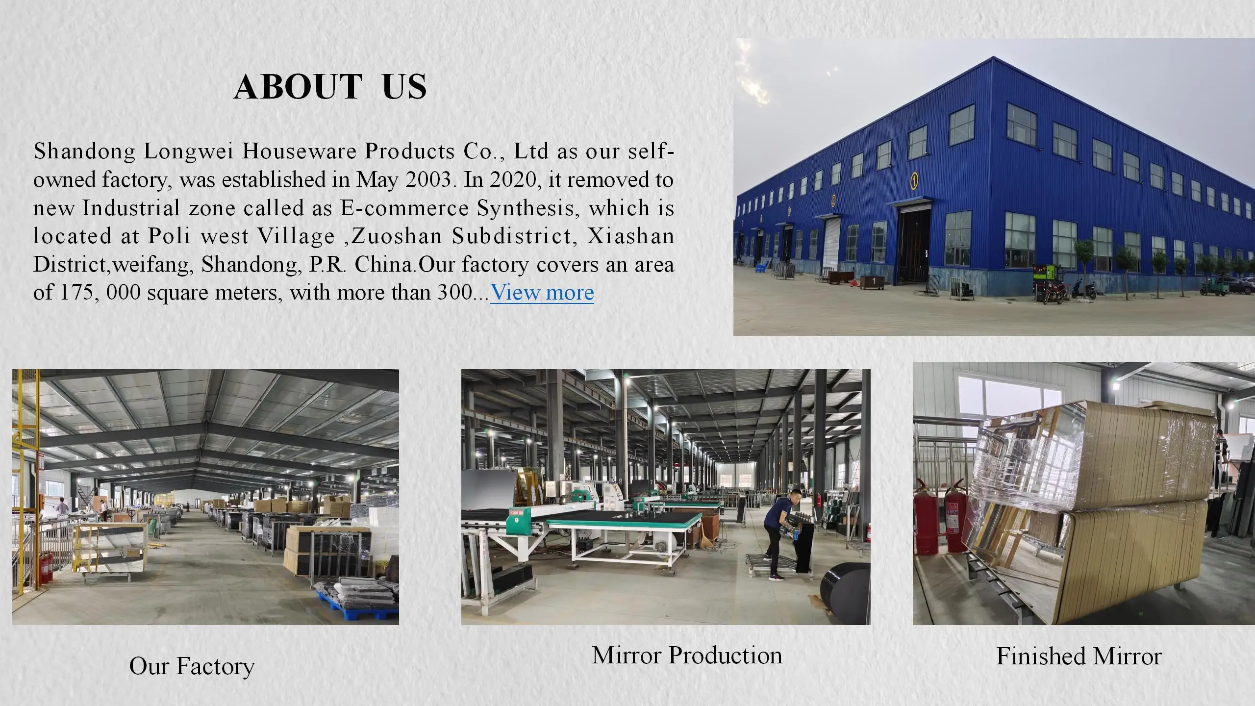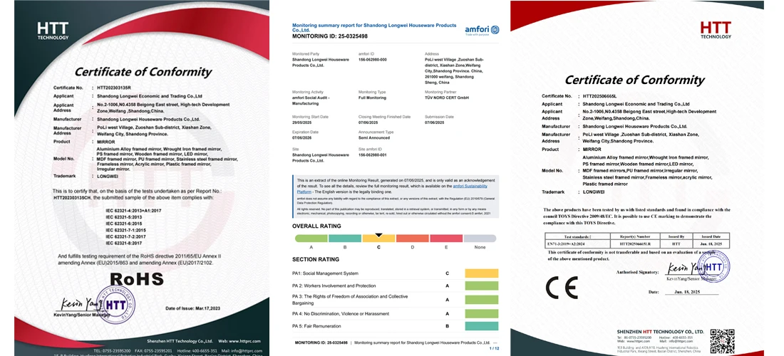 Shandong Longwei Economic And Trading Co., Ltd. is a home & garden manufacturer with over 20 years of export experience. Specializing in mirrors, LED bathroom mirrors, and photo frames, the company offers customized shapes, sizes, and materials. With SGS certification and stable delivery, it supports large orders and provides ex-factory pricing and strong after-sales service.